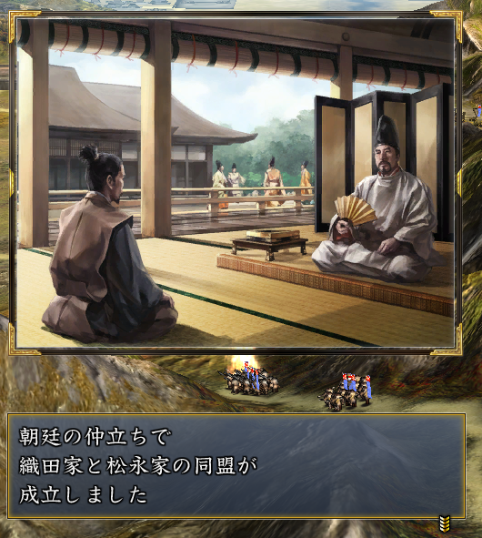同盟がきれたところで、しょうがないので朝廷を介して松永家と同盟。