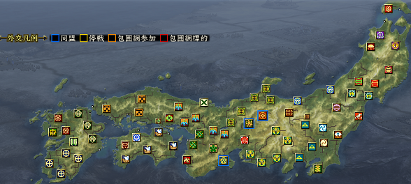 有力大名は、徳川家7ヶ国、豊臣家6ヶ国、長宗我部家5ヶ国、島津家5ヶ国です。