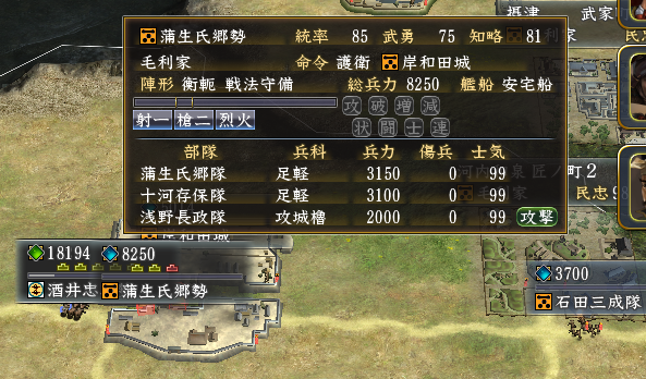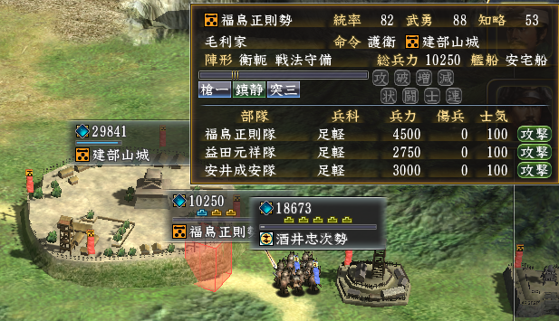 十河存保隊3,000と以心崇伝隊2,700と石田三成隊3,700が援軍として城へ入城します。