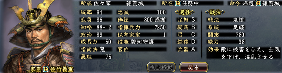 統率、武勇、知略、政治ともに優秀、戦法は鬼槍です。