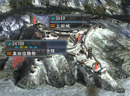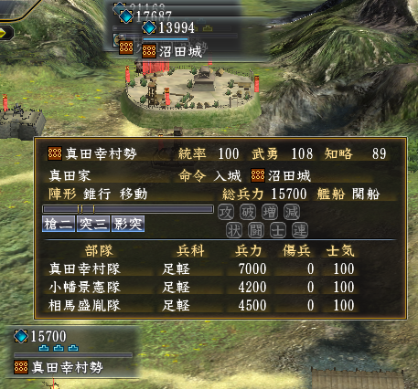 奪い取った北信濃から、真田家所領の上野にある支城沼田城 兵力50,000ほどを狙います。