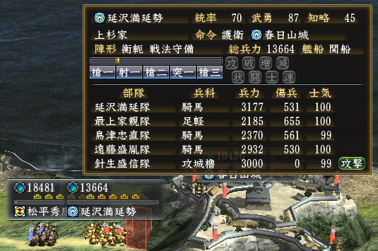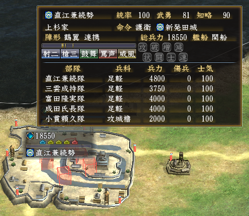 直江兼続勢、4部隊の前になすすべなく城へ退却。
