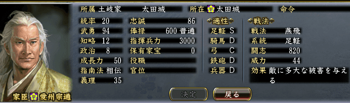 愛州宗通 足軽適正S、戦法:燕飛