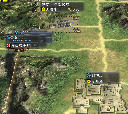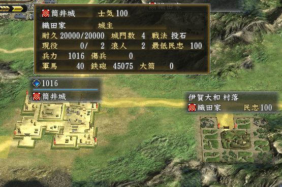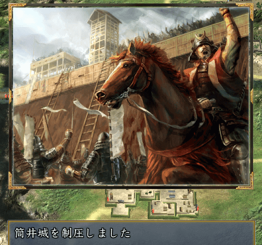 弓隊や鉄砲隊で城内兵士を0にして、筒井城陥落。