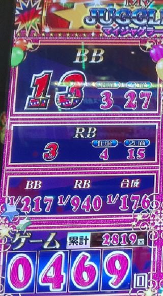 マイジャグラー3 BIG2 REG0。その後、112Gでやめている台を打ちます。
