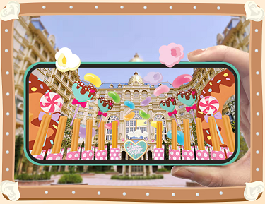 客室内に用意してあるリーフレットの二次元コードを読み取り、ホテル敷地内の対象エリアでスマートフォンをかざすと、カラフルで甘い夢の世界が広がります。