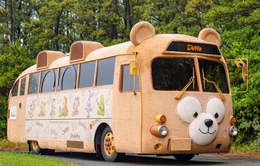 ダッフィー&フレンズが描かれ、ダッフィーのぬいぐるみと同じ生地で車体をラッピングした特別仕様のバス